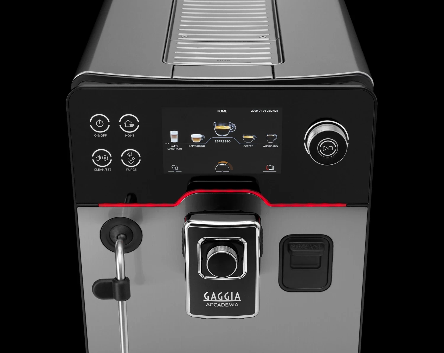 The Accademia has the rare distinction of being an Italian made and manufactured espresso machine complete with a metal frame and housing. Its full color 5-inch touch display is vivid, crisp, and highly responsive. Additional navigation is handled in the margins with a suite of four capacitive touch buttons on the left and a textured rotary knob and selector on the right. The top half of the front panel is backed with black glass and accented with the backlit Gaggia Milano red stripe. Cups can be stored on the programmable and electrically heated cup warmer that can be set with unique timers to turn on and off automatically throughout the day.