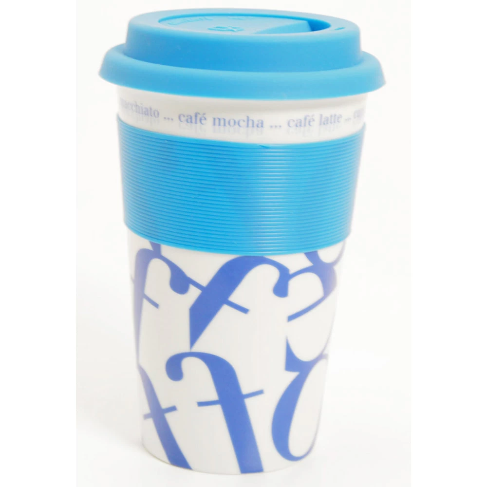 The Waechtersbach Coffee-Script-Collage 12 oz Travel Mug with Silicon Lids and Grip-Strip brighten your morning commute in lively colors of purple, blue, lime green and red. Designed by the world-renowned porcelain experts at Konitz-Waechtersbach and manufactured at their plant in Thailand, these tough, porcelain, 5 ½” tall mugs have a great hand-feel and a well designed side slope complemented by the silicon grip-strip so you can keep a one-handed hold on your brew as you hurry to work. The bold script and bright colors make your mug easily recognizable in an office environment. They are dishwasher safe and make great presents for the commuter on your gift list.